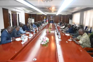 Autour du Président de la République, tout le Comité de suivi était convié notamment Obed NAMSIO, Ministre d’Etat Directeur de Cabinet de la Présidence, Arnaud DJOUBAYE ABAZENE, Ministre d’Etat en charge de la Justice, Aurélien Simplice ZINGAS, Ministre d’Etat en charge de l’Education Nationale, Thierry Patrick AKOLOZA, Ministre en charge du Commerce et de l’Industrie, Rufin BENAM BELTOUNGOU, Ministre des Mines et de la Géologie, Rameau Claude BIREAU, Ministre de la Défense Nationale, Eric REKOSSE KAMOT, Ministre de l’Équipement et des Travaux Publics, GUISMALA HAMZA Ministre de l’Agriculture, Albert Yaloké MOKPEME, Ministre Conseiller en Communication Porte-Parole de la Présidence, Ousmane TINGUERE, Ministre Conseiller en matière de Coopération Internationale ainsi que tous les Experts des départements ministériels concernés. Les mémorandums reçus et présentés par le Ministre d’Etat Obed NAMSIO vont être analysés et travaillés par chaque département pour la prochaine réunion prévue le mois de juin.